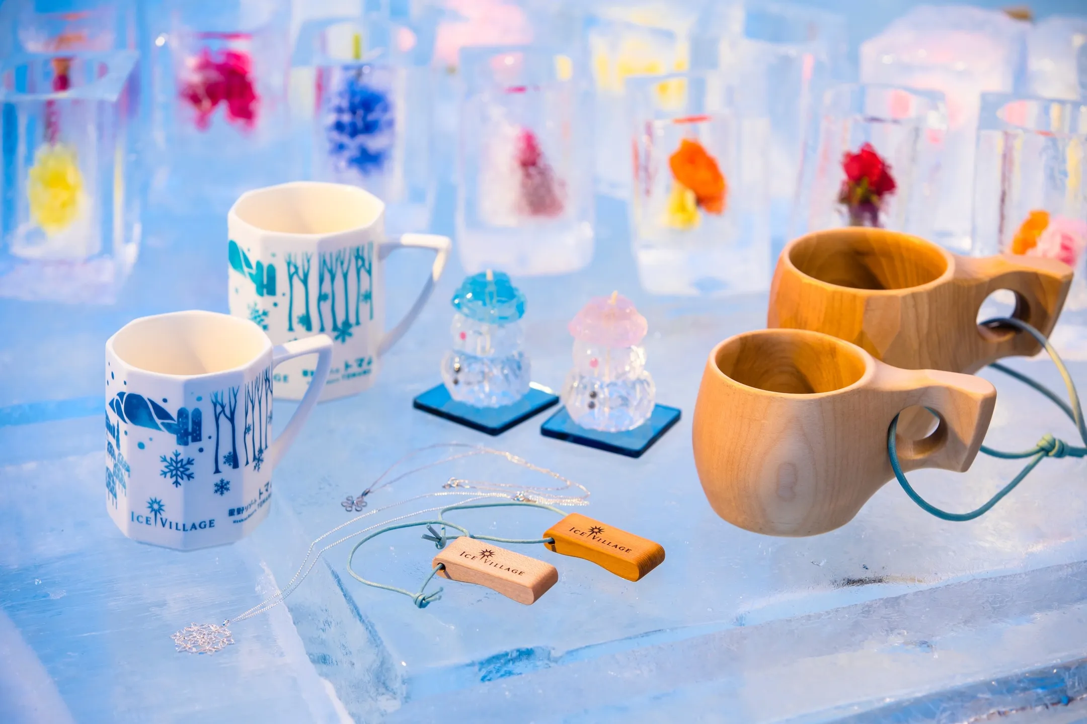 「氷の雑貨屋」は、氷や雪をテーマにした雑貨屋です。ここでは、氷の棚に北海道の作家が作った雑貨、クラフトやアクセサリー、アイスヴィレッジオリジナルのマグカップなどを氷の世界の大切な思い出として購入できます。