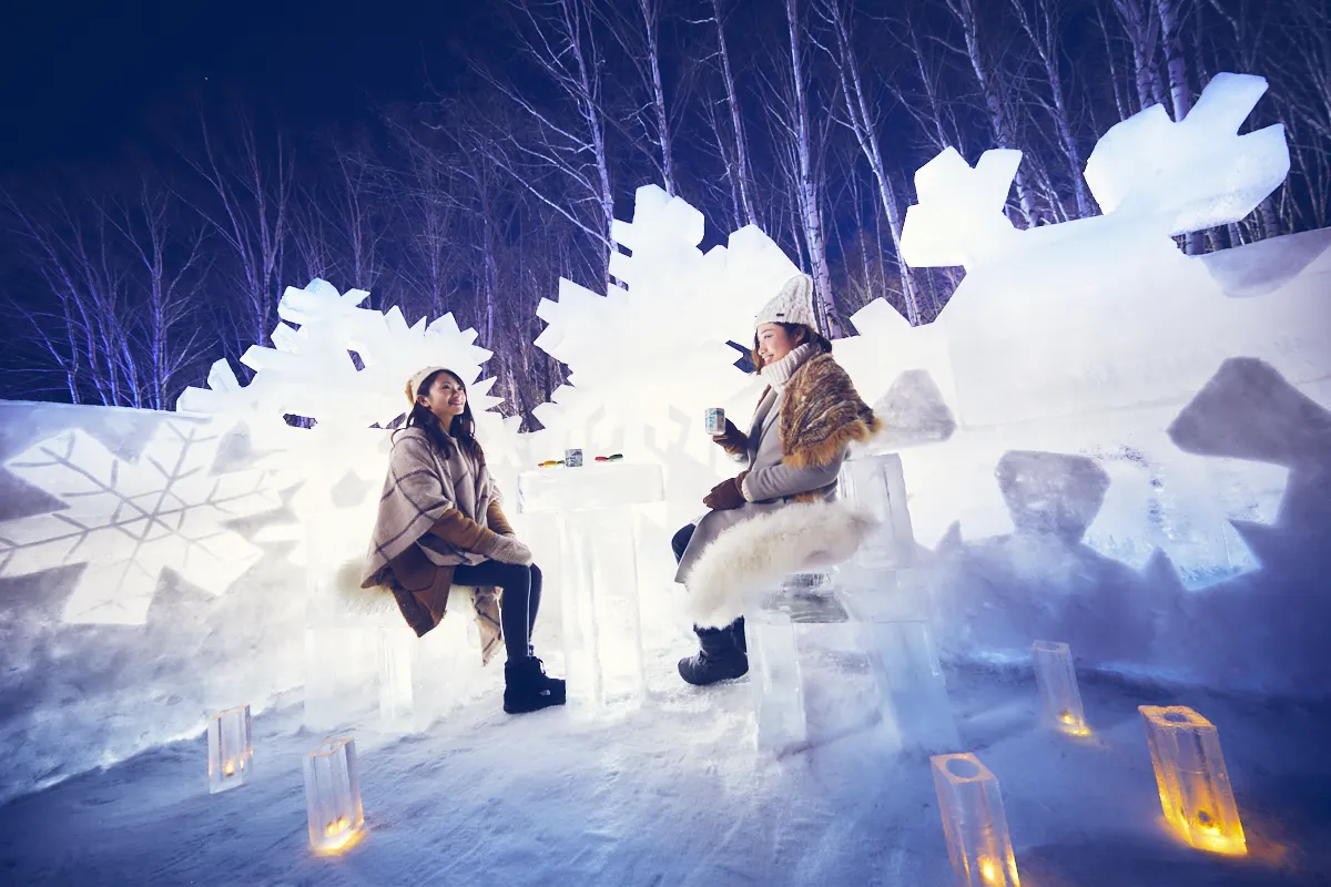 「氷のクリスタルパーク」は、雪の結晶がデザインされた氷のテーブルやイスが並ぶ幻想的な空間です。ここでは、氷の街を取り囲む白樺の森、氷や雪で造られた街並みなどの風景を眺めながら、ゆったりと過ごすことができます。また、「氷のBakery&Cafe」や「氷のSweets Shop」から軽食や飲み物をテイクアウトして楽しむのがおすすめです。毎日19時30分には、澄み切った冬の夜空を彩る花火(約5分間)をこの場所から観ることもできます。