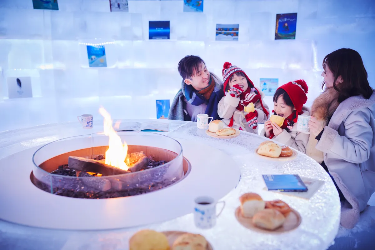 「氷のBakery&Cafe」は、氷の棚に並んだ焼き立ての美味しさを瞬間冷凍したパンと温かい飲み物を堪能できる場所です。氷の棚に並んだ15種類のパンの中から好きなものを選べます。購入時に、パンを温めることでまるで焼き立てのような香ばしい匂いと熱々の食感を楽しめます。店舗内には、氷に囲まれた暖炉があり、火を囲みながらパンと一緒に温かい飲み物や、熱々のチーズフォンデュなども味わえます。ここで販売しているパンや飲み物は、テイクアウトすることもでき、氷のクリスタルパークで食べるのがおすすめです。