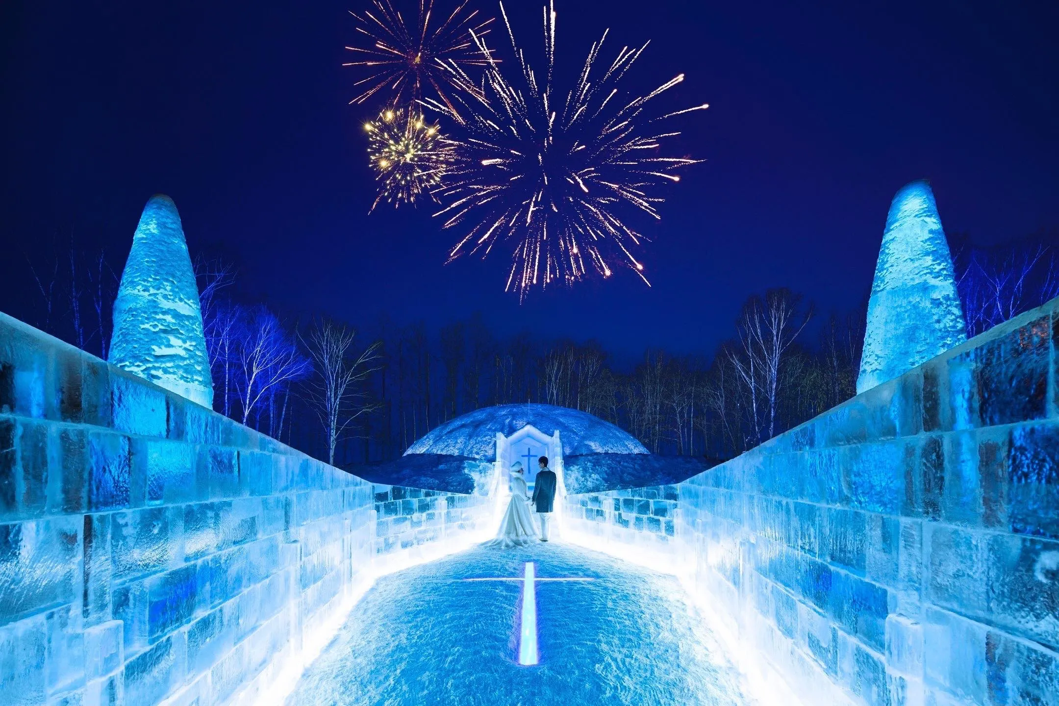 「2人の純粋な気持ちが、途切れなく続く」という想いを込め、天井と壁に継ぎ目がない一枚氷で造られるのが「氷の教会」です。内観は、祭壇、十字架、バージンロードやイスなど全てが雪と氷でできています。約1か月間という短い期間に、毎年60組以上の挙式が行われ、挙式後には新郎新婦を祝福する花火が氷の街を彩ります。