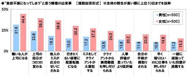◆食欲不振になる職場の出来事 「嫌いな人が上司に」「指示がコロコロ」「責任転嫁される」