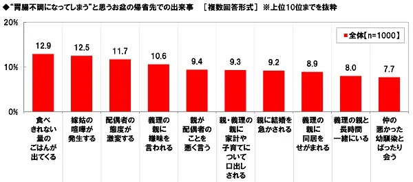 全回答者(1,000名)に、“胃腸不調になってしまう”と思うお盆の帰省先での出来事を聞いたところ、「食べきれない量のごはんが出てくる」(12.9%)が最も高く、次いで、「嫁姑の喧嘩が発生する」(12.5%)、「配偶者の態度が激変する」(11.7%)となりました。