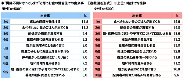 男女別にみると、男性では1位は「嫁姑の喧嘩が発生する」(11.8%)でした。男性には、帰省先でリラックスしようにも、嫁姑の喧嘩を目の当たりにしたら胃腸不調になりそうだというイメージを持っている人が多いようです。