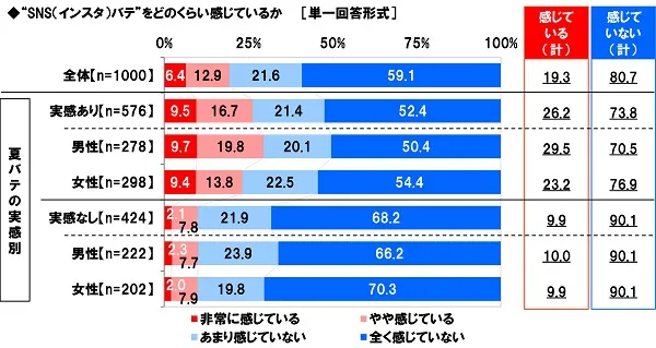 また、“SNS(インスタ)バテ”(SNSでいいね!をもらうために頑張り過ぎて疲れてしまうこと)をどのくらい感じているか聞いたところ、『感じている(計)』と回答した割合は19.3%でした。