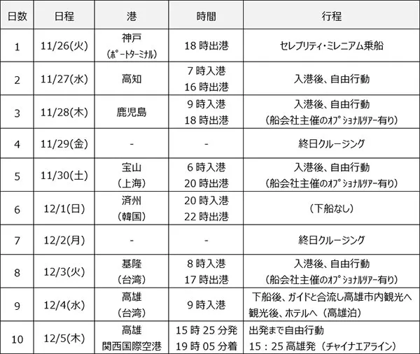 ・出発日:2019年11月26日(火曜)(神戸港発/関西空港着10日間)