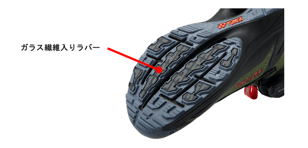 アウトソールにガラス繊維入りラバーを採用することで、雨天や凍結路でもグリップを発揮します。