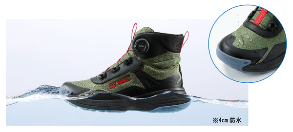 アッパー部分に防水フィルム・撥水合成繊維(メッシュ)、インソールに透湿性合成樹脂を使用し、水を弾きながら蒸れにくい快適な履き心地をキープします。