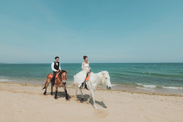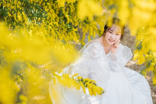 河津桜と同時期に見頃を迎えるミモザも華やかに咲き誇ります。希望に合わせて海やお花畑、乗馬フォト、さらにチャペル風フォトなど、さまざまなバリエーションの撮影が可能です。