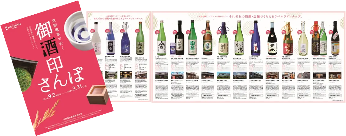 「御酒印帳」とは、柿本商事株式会社の登録商標で、御酒印帳公認酒蔵を巡って各酒蔵の御酒印(お酒のラベル)を収集し、お酒の感想などを記録して楽しむものです。今回は、公認酒蔵だけでなく本企画限定でご協力いただく酒蔵も加え、京阪沿線の16蔵を巡る企画として実施。期間中には、本企画でしか手に入らない京阪電車オリジナルペアグラスが当たるSNSキャンペーンも実施します。また、8月30日(金)には、企画の開始に先立ち、京橋駅中央改札口前で参加酒蔵による試飲イベント(有料)も開催します。