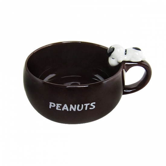 続いては、スヌーピーのフィギュア付きマグです。深いブラウンカラーのマグの上に、かわいいスヌーピーがくっついています。マグの中を覗いているようですね♪カップ部分のデザインは、PEANUTSのロゴのみのシンプルさ。