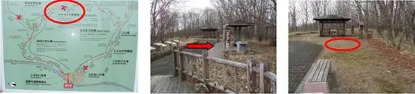 左から)釧路湿原遊歩道 地図看板 丸印が設置場所、サテライト展望台 矢印が設置場所、サテライト展望台 丸印が設置場所