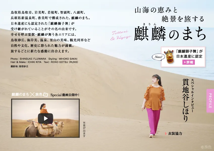 電子雑誌「旅色」は、一般社団法人麒麟のまち観光局(https://www.kirinnomachi.jp/org/)と提携し、鳥取県鳥取市、岩美町、若桜町、智頭町、八頭町、兵庫県新温泉町、香美町の旅を特集する別冊を公開しました。同観光局は、日本遺産にも認定された伝統芸能「麒麟獅子舞」が受け継がれている鳥取県・兵庫県をまたぐ1市6町が「麒麟のまち」として、観光や移住・定住など様々な分野で連携し、魅力あるまちづくりに取り組んでいます。今回は、豊かな自然や文化、歴史に彩られた麒麟のまちの絶景や恵まれた山海の幸など、さまざまな魅力を女優の貫地谷しほりさんが誌面と動画でたっぷりとナビゲートします。