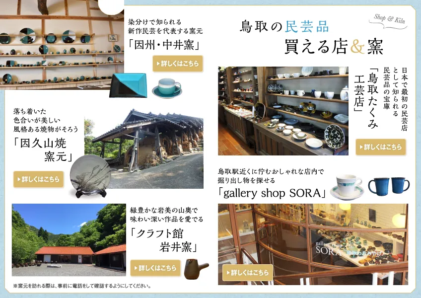 鳥取には、長い歴史と豊かな自然が育んだ陶磁器や因州和紙など、貴重な工芸品が受け継がれています。大正時代、地元出身の医師・吉田璋也が中心となって興した民藝運動以来、その美しさや使い心地は「用の美」と呼ばれ、いまも多くの人を魅了してやみません。食器や電気スタンドなど、鳥取の名作を旅のお土産に持ち帰りませんか?購入できるお店や窯もご紹介しています。
