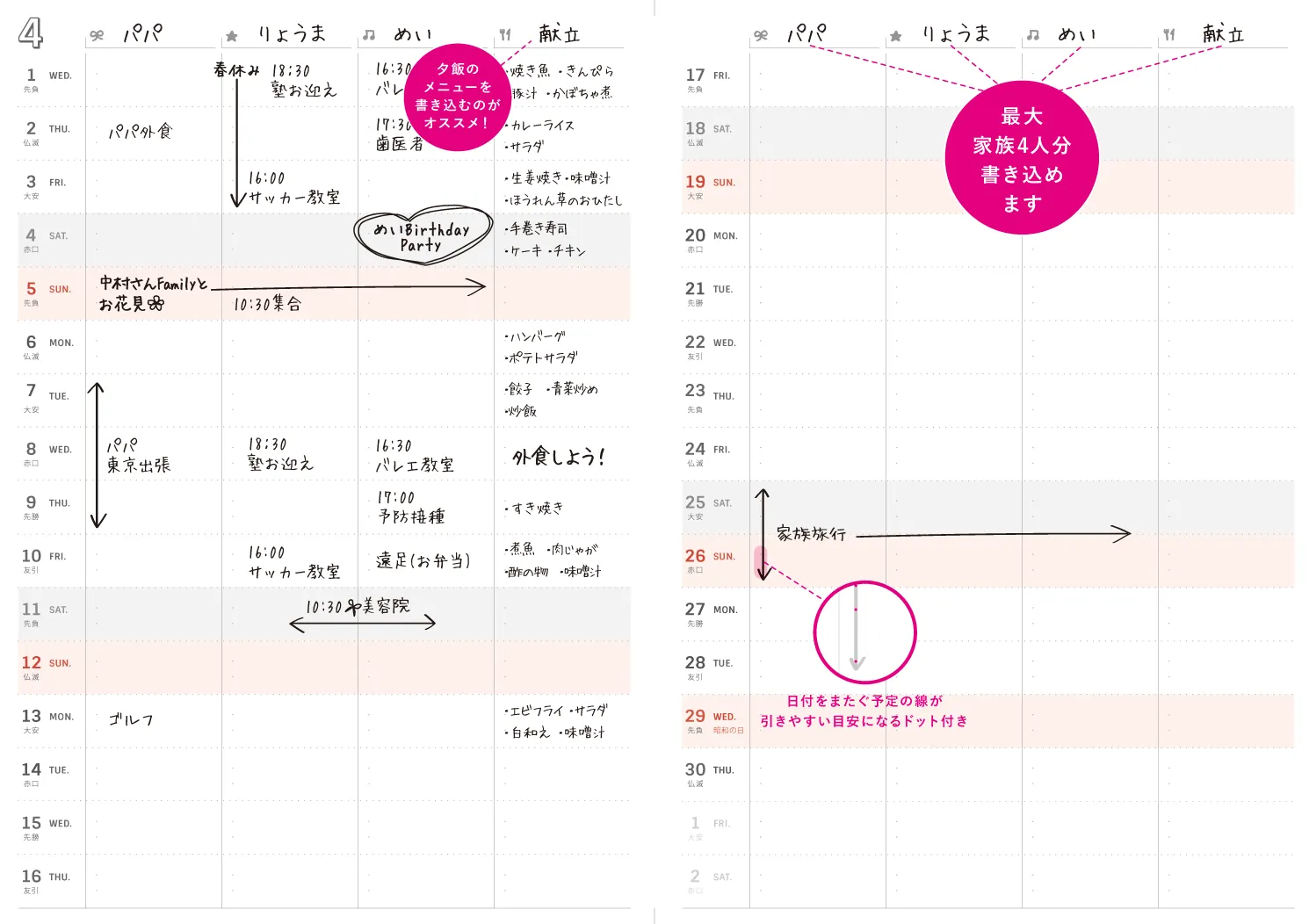 今までの手帳では、家族のスケジュールがパパッと見られない、書けない。そんな悩みを解消!