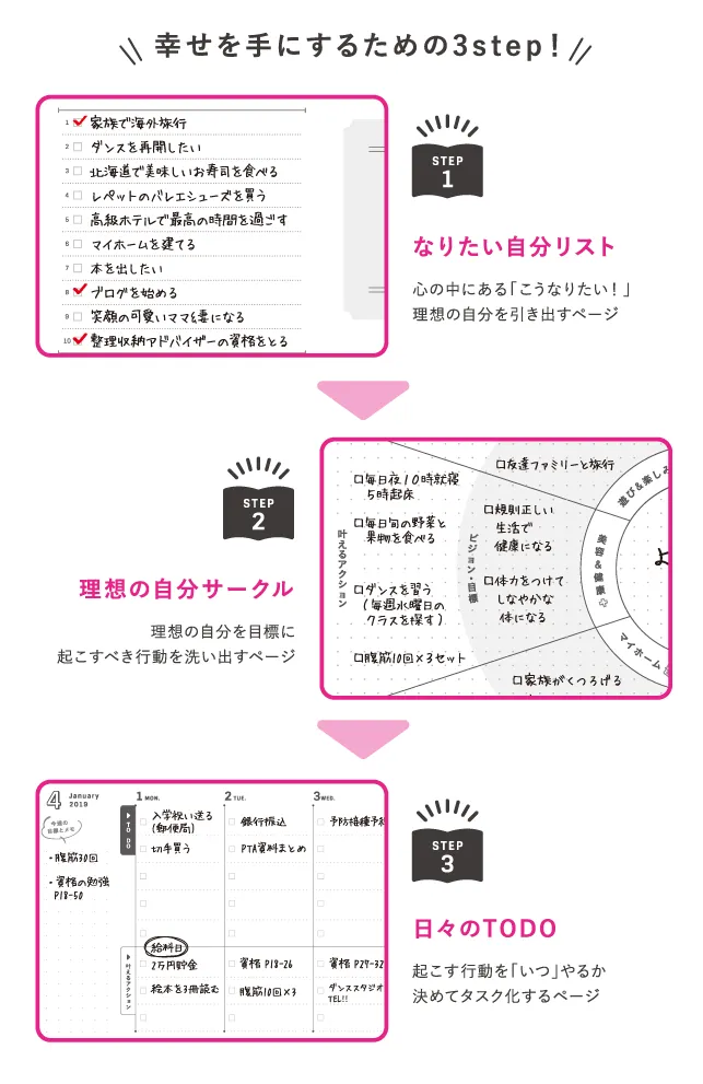 ワクワクする3ステップを書き込んでスタート。なりたい自分に向かって、無理せず、少しずつでも、進んでいけるようになっています。