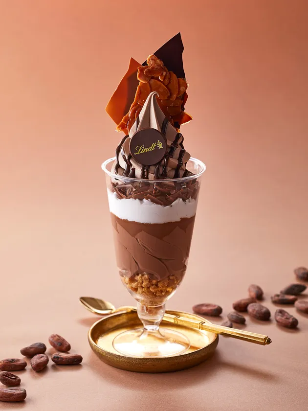 リンツの上質なチョコレートをふんだんに使用した、チョコレート好きにはたまらないショコラ パフェが新登場します。リンツ ショコラ カフェで高い人気を誇る、なめらかな口どけのソフトクリーム ショコラを中心に、様々な食感と味わいを重層的に組み合わせた、チョコレートが織りなすハーモニーをお楽しみいただけます。ミルキーでコクのあるミルクチョコレートソフトクリームやカカオのアロマが力強いダークチョコレートソフトクリームを中心に、食べ進めていくほどに、濃厚なチョコレートソースやパリパリとした食感が楽しいチョコレートのコポー、ふんわり軽いホイップクリーム、ザクザクとした食感のへーゼルナッツのクルスティヤンが加わります。トップには、艶が美しいミルクとダークのチョコレートプレートや香ばしいアーモンドのヌガティーヌで、華やかなデコレーションが施されています。