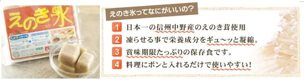 えのきたけをペースト状にしたものを加熱し、凍らせることで、えのき数束分の栄養を詰め込み、効率よく体内に吸収できるようにしたものです!えのき氷は開発以来絶えず注目を集めている超優れものです!凍ったまま味噌汁やカレーなどいろいろな料理に加えると、うまみやとろみが付き、おいしくエノキタケの栄養分を摂取することができます!