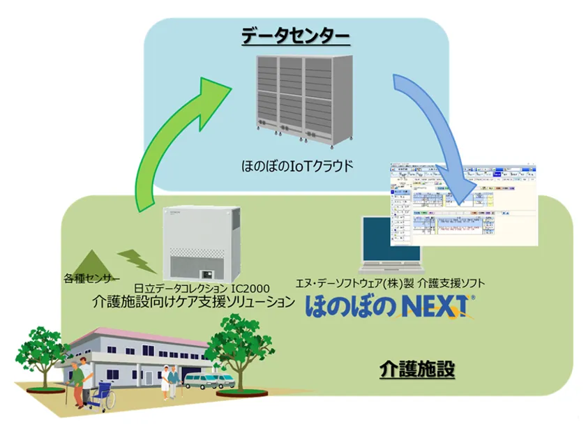 株式会社 日立情報通信エンジニアリング(代表取締役社長:岩崎 秀彦、本社:神奈川県横浜市)と、エヌ・デーソフトウェア株式会社(代表取締役社長:佐藤 廣志、本社:山形県南陽市)は、各種センサー(*1)から情報を収集し、電話機への通知や情報の見える化で介護スタッフの業務効率化と利用者の安心・安全をサポートする「介護施設向けケア支援ソリューション」と、ケア記録や請求業務のICT化で業務の効率アップを実現する「ほのぼのNEXT」が相互連携し、センサー情報を介護支援ソフトに自動転記する機能を9月9日から販売開始します。