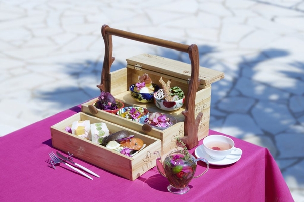 朝食には、本プラン限定の「ブーゲンビリアブレックファスト」を用意します。貸し切りの屋外会場でブーゲンビリアを眺めながら、朝食を食べることができます。華やかなピンク色が特徴のブーゲンビリアは、食用としても楽しむことができます。ブーゲンビリアカラーのクリームを使用したフルーツサンドや、ブーゲンビリアの生花を使用したお花のサラダを用意。見た目も華やかなテイクアウト BOX です。