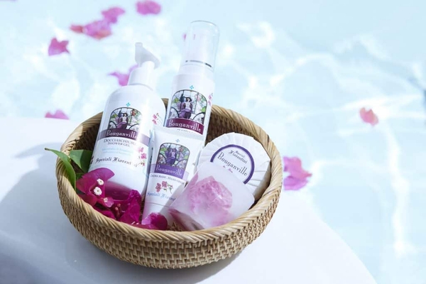 客室にはブーゲンビリアの甘い香りに包まれる「ブーゲンビリア BOX」を用意します。スパで癒された後、余韻を楽しむことができる BOX です。客室でのバスタイムを贅沢に彩るフラワーバスや、ブーゲンビリアの香りを堪能できるボディクリームやハンドクリームを用意します。