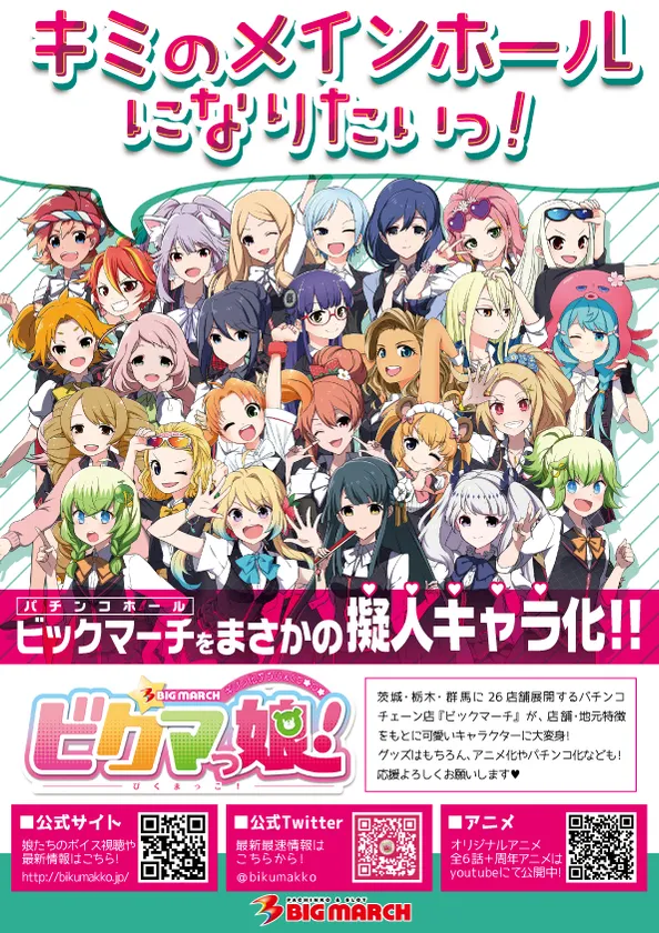 「キミのメインホールになりたい!」を合言葉に、店舗および地元の特徴をもとにしたビックマーチ26店舗それぞれのオリジナル萌えキャラをリリースし、オリジナルグッズ化やYouTubeでのアニメ配信、オリジナルパチンコ機のリリースなど、独自の取り組みを行ってまいりました。