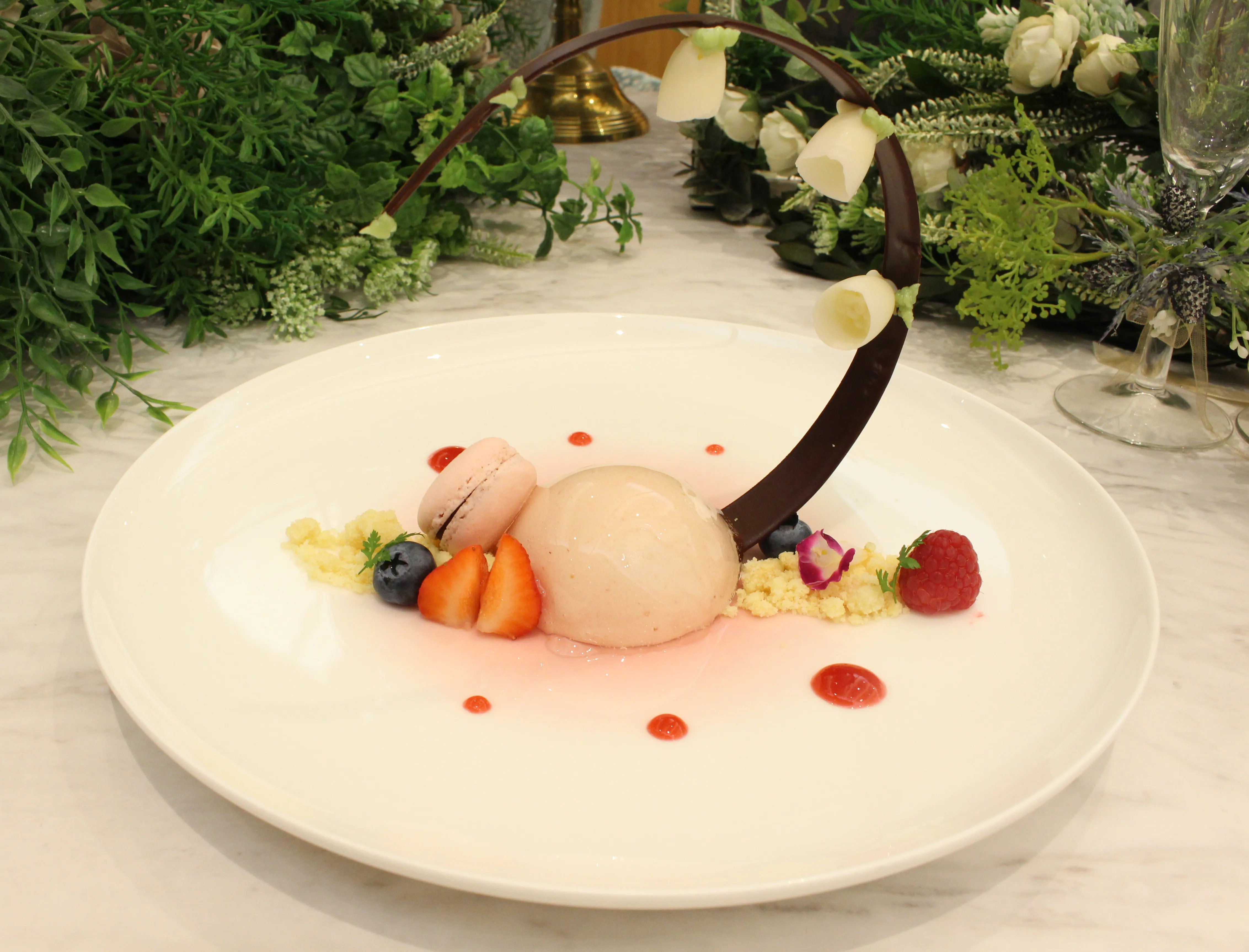 甘酸っぱい「いちごのムース」の中に隠れているのは、コクのある「蜂蜜のブリュレ」。そこからまるで本物のように咲いているのは“すずらんの花”をイメージした「ボンボンショコラ」です。
