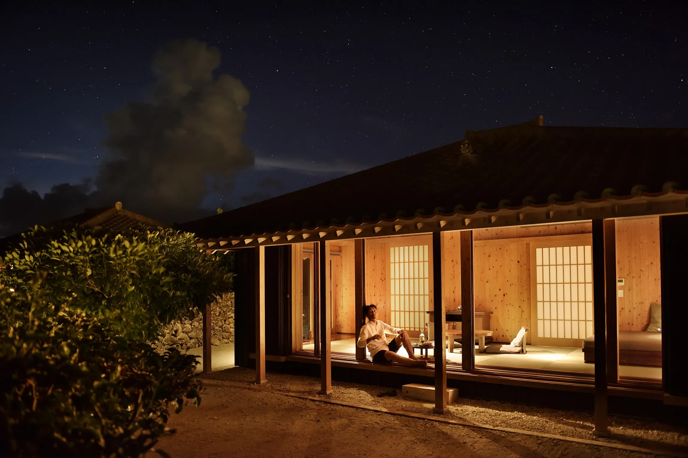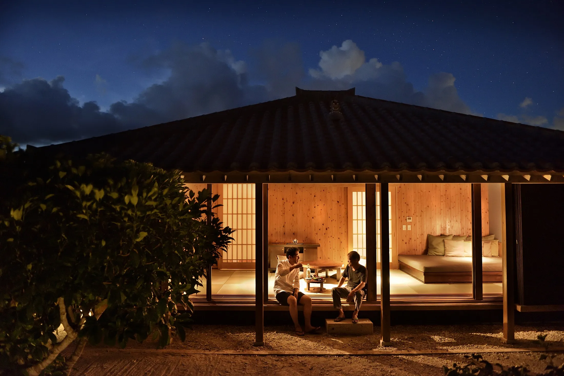 客室に竹富島の島人を招き、ふたりきりで晩酌を楽しみます。ブルーゾーンの研究では、毎日の適度な飲酒や友人との交流が健康によい影響を与えていると言われています。心地よい夜風が感じられる客室の縁側で、島人と泡盛を片手に語らう、贅沢な夜のひとときです。
