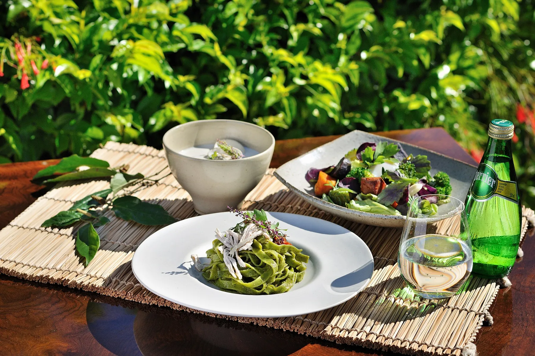朝から畑で体を動かした後に食べる野菜が中心の昼食です。島で親しまれている野菜やハーブのサラダや、島豆腐のクラムチャウダー、ハーブを練りこんだ爽やかな風味のパスタなど、島の畑の恵みが楽しめます。天気が良い日は、暖かい日差しを感じながら外で食べることもできます。