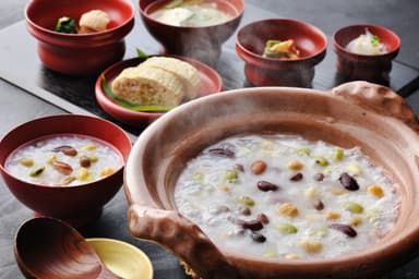 信州には、古くから地域限定で少量生産され続けている品種の豆が複数あります。県東部の一部でしか栽培されておらず、「こうじを使わなくても甘くておいしい味噌ができる」といわれる大豆「こうじいらず」。また、県北部で100年以上作られている在来種のあずき「桜仙峡あずき」もその一種です。本献立では7種の豆と米、「凍り餅(*)」を、干した野菜やきのこの出汁で炊き上げる「豆かゆ」を用意します。「寒干し大根」の炊き合わせや、干し野菜の旨みと食感が特徴の出汁巻き玉子などと共に楽しめます。
