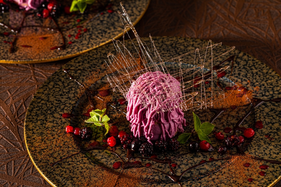 甘さ控えめの紫芋のクリームでコーティングされたモンブランケーキは、紫色に染まる富士山をイメージ。山頂には霧を表現した飴細工が覆い、裾野にはチョコレートソースの大きな蜘蛛の巣を張り巡らせ、味のアクセントとなっています。