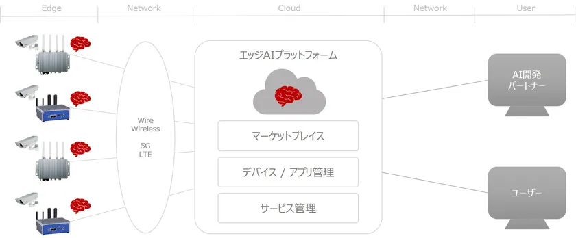 今回両社が業務提携により事業化を進めるエッジAIプラットフォームは、エッジAIを実現するデバイス(以下、エッジAIデバイス)を一元的に管理する機能とともに、さまざまなAIアプリを販売・購入できるマーケットプレイスを備えています。