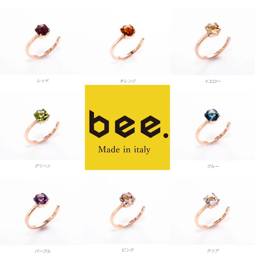 「bee」リングは、日本でデザインされ、イタリアの工房で熟練の職人により1点1点丁寧に作られています。「bee」リングの六角形のイエローボックスも“Made in Italy”です。