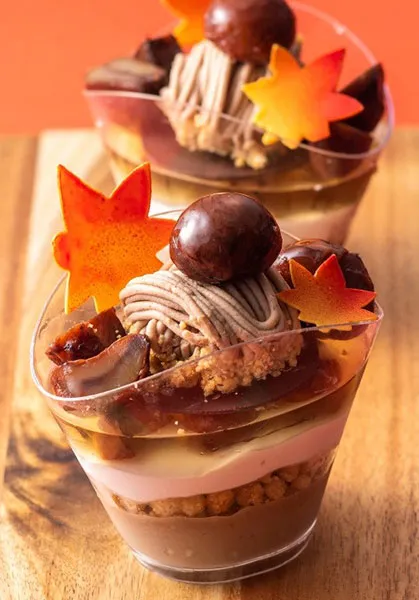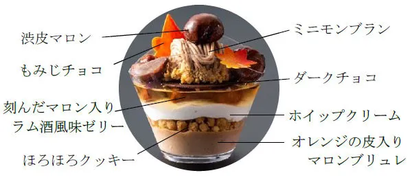 秋の味覚「栗」を、渋皮マロンやラム酒風味のゼリーなど様々に仕上げたモンブランがカップに入って登場。ブリュレにクッキー、チョコなど食感の違いも楽しめます。全ての層を横から見ながらスプーンでひとすくいし、口に広がる味をお楽しみください。