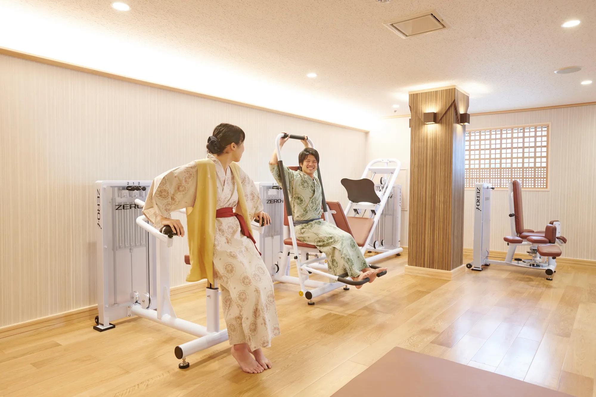 これは理学療法士の先生監修の下、栃木県宇都宮市に本部を置く、ビッグツリースポーツクラブの指導を受け、温泉入浴とストレッチルームの利用並びに、アスレチックコーナー(屋外)での体験を利用することで、宿泊のお客様に、健康への気付きとより元気になってお帰りいただけるよう、新しいサービスとして導入いたしました。