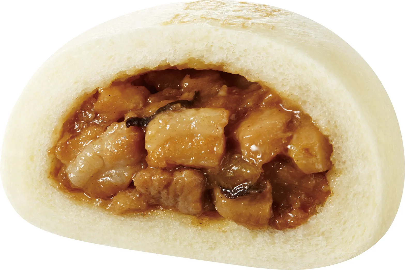 ●商品特長 : 代表的な台湾料理「ルーロー飯」を中華まんにしました。ごろごろと大きめにカットした豚バラ肉を甘めの醤油ベースのタレで煮込み、もちもちとした二段発酵熟成生地で包みました。八角の独特な甘い香りも特長です。