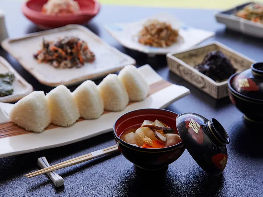 朝食は、地元の契約農家のお米を使い、スタッフが愛情込めた、炊きたて&握りたてのおにぎりを、地元野菜をふんだんに使った豚汁とともに、ブッフェ形式でご提供します。