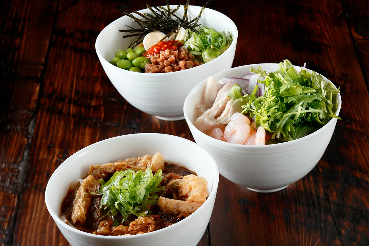 フォー風ヌードルやカレーうどん、まぜ麺風など3種のスープと麺、多彩な具材を組み合わせてオリジナルヌードルづくりをお愉しみいただけます。