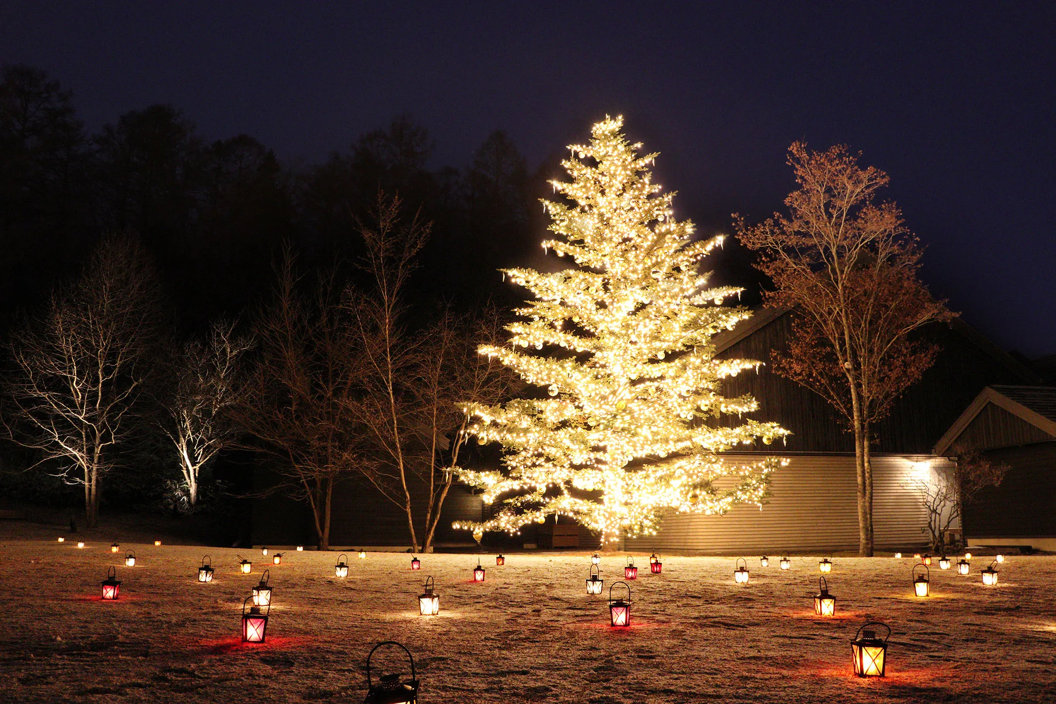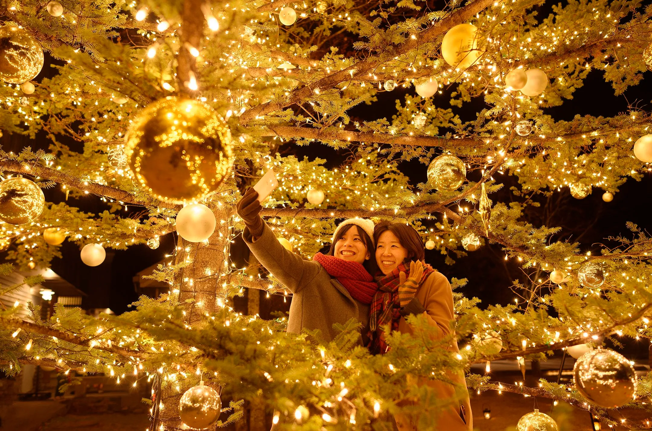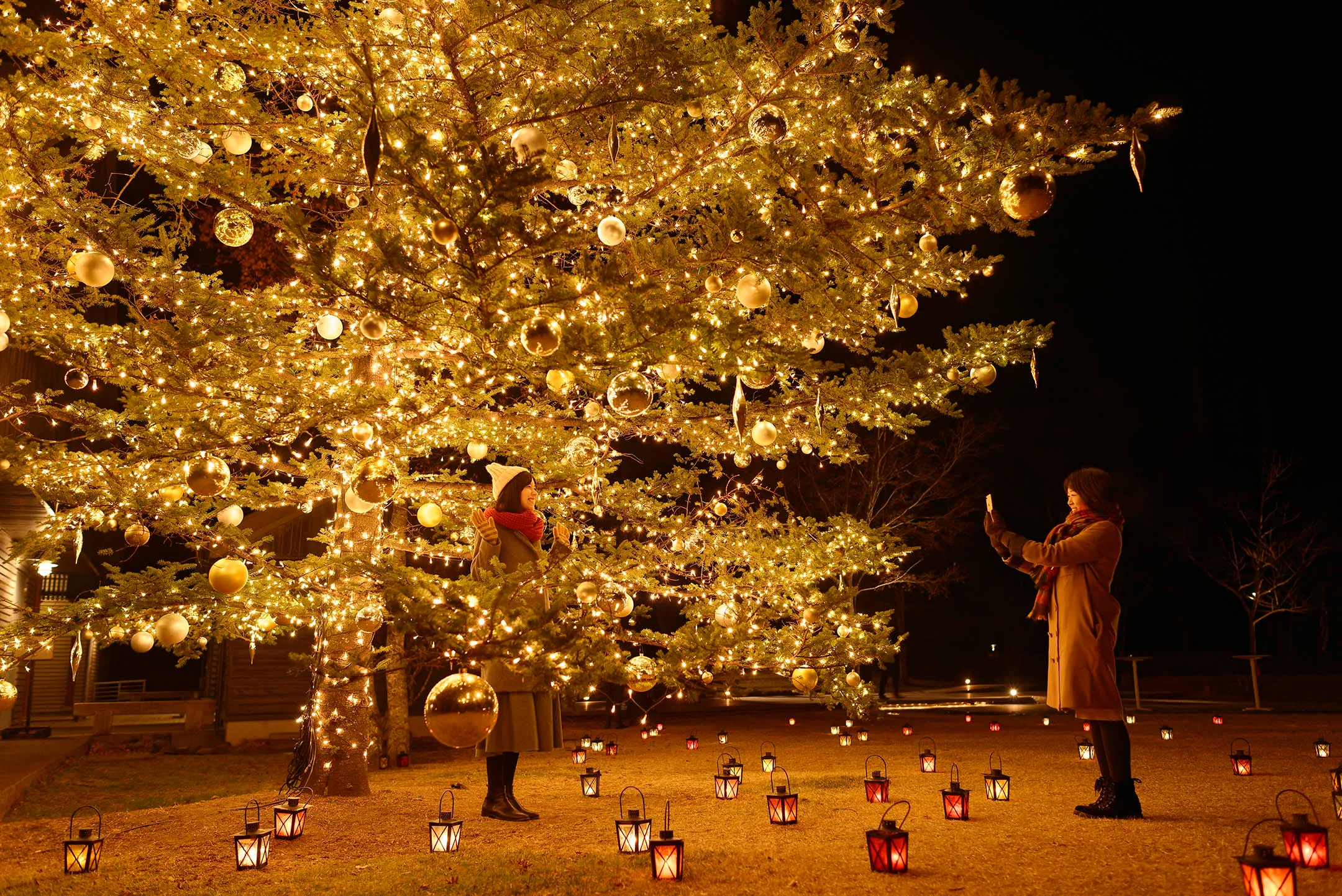 「軽井沢星野エリアのクリスマス」のシンボルツリーは、高さ10mの本物のもみの木です。ツリーの枝と枝の間に立つと、星屑の中に紛れ込んだような、キラキラした写真を撮ることができます。期間中毎日、イルミネーションが灯ります。
