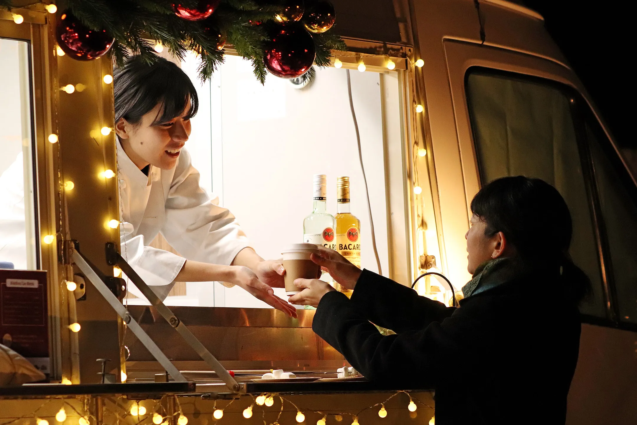 アドベントナイツの2日間、もみの木広場にホットチョコレートとスモアを販売するキッチンカーが登場します。キッチンカー内のホットチョコレートバーに並ぶトッピングは、ホワイトチョコレートチップ、シナモンスティック、ココナッツ、ドライフルーツ、チョコスプレー、ホイップクリームなど、約10種類。ホットチョコレートに、好みのトッピングを自由に好きなだけあわせ、自分好みのオリジナルのホットチョコレートが作れます。スモアづくりでは、焚き火にかざしながら焼いた温かなマシュマロとチョコレートを、ビスケットに挟んで味わいます。