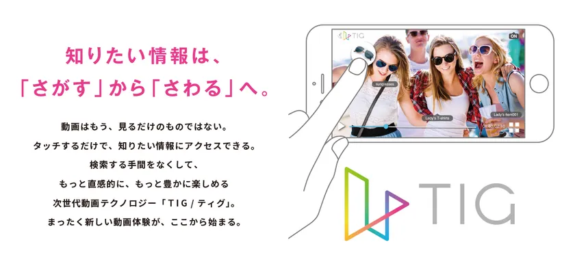 パロニムが開発した新時代型動画拡張テクノロジー「TIG」は、動画視聴中に、商品や音楽、料理、人物、場所など、気になったものに「さわる」だけで、瞬間的に情報をストックできる技術です。ストックした情報の詳細ページへは、視聴中や視聴後など、ユーザーのタイミングで自由に閲覧でき、商品の購入ページや、出演者の情報、また、アクセスマップや、音楽ダウンロードページなど知りたかった情報へとダイレクトにアクセスすることができます。「動画→検索」が不要となることで、検索リテラシーや言語依存による言葉の壁も解消され、誰でも平等に、且つ、直感的に「情報⇔動画」をお楽しみいただけるようになります。