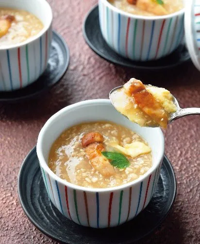 秋の味覚たっぷりの炊き込みご飯に、低温で火入れしたやわらかい黒毛和牛をのせ、仕上げに茸餡を。