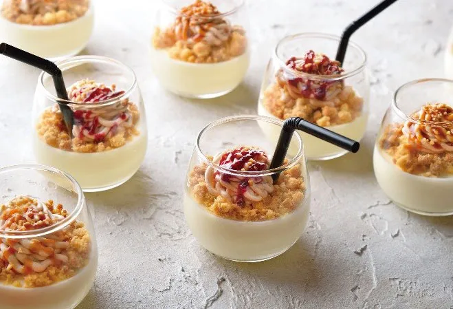 ストローでも飲めるレアチーズケーキ。モンブランクリーム、ソースをかけて。