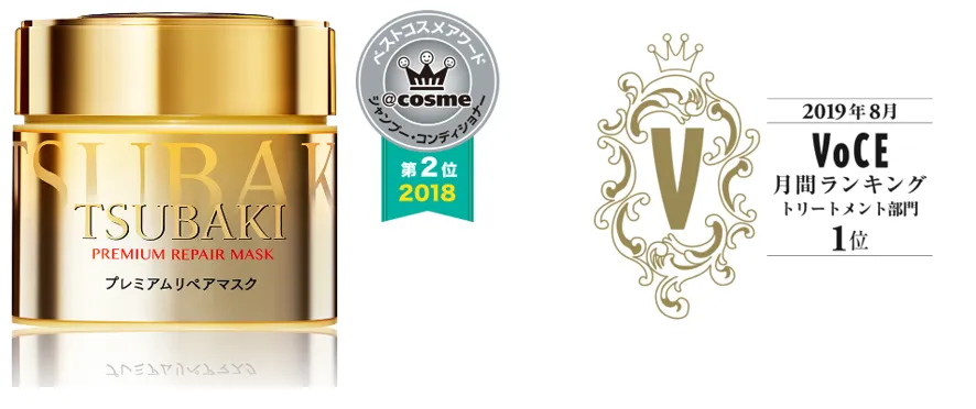 「TSUBAKI プレミアムリペアマスク」は、2018年に@cosmeで受賞、また、VoCE月間ランキング2019年7月度第1位にも輝き、大好評を頂いています。濃密な美容成分を髪の芯まで深く・たっぷり浸透させるサロンの浸透技術を応用。毛先までつやに満ちた極上の「なめらかサラサラ髪」に仕上げます。
