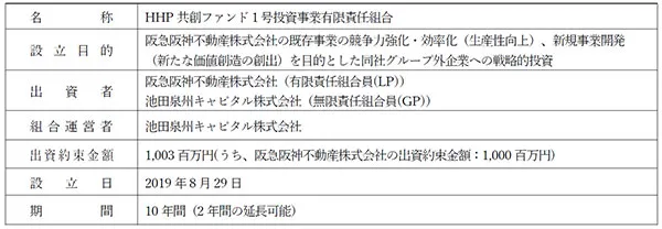 阪急阪神不動産株式会社(本社:大阪市北区、社長:若林常夫)では、今後の急激な技術革新や社会価的値観の変化を見据えた当社の既存事業の競争力強化や新規事業開発に向けて、今般、コーポレートベンチャーキャピタルファンド「HHP共創ファンド1号投資事業有限責任組合」を新設し、スタートアップ(成長志向の新興企業)との共創を加速させます。