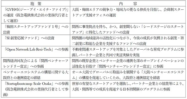 当社及び当社のグループ会社では、これまで「Open Network Lab Resi-tech」や「Startupbootcamp Scale Osaka」等のアクセラレーションプログラムにパートナー企業として参画し、スタートアップとの共創に取り組むとともに、関西圏の地域経済活性化につながるスタートアップ起業支援を企図した「梅田スタートアップファンド1号」や「SI創業応援ファンド」への出資を行っております。