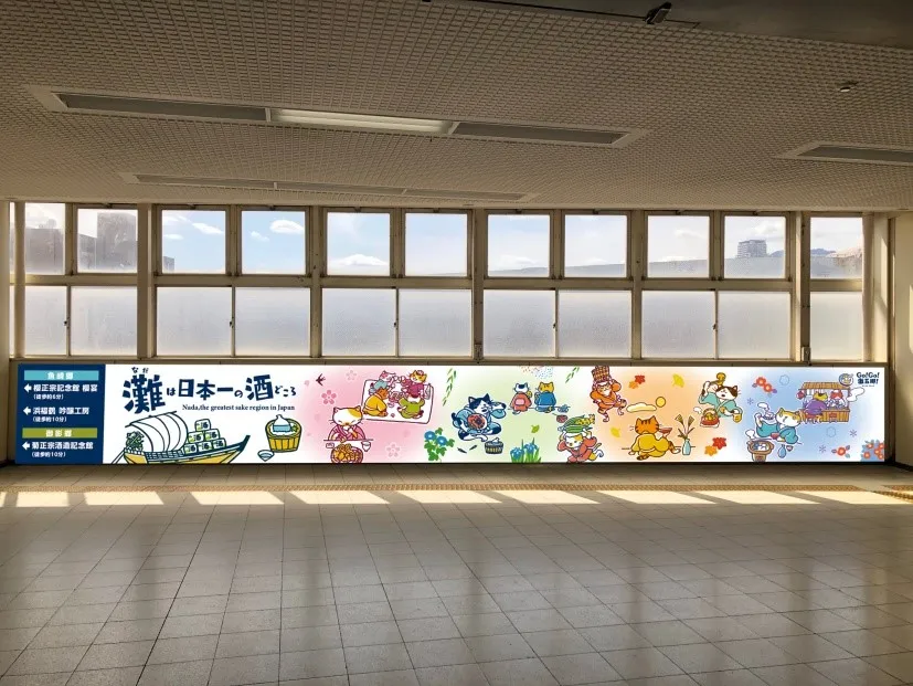 酒蔵の最寄り駅となる阪神電車の10駅を対象に、駅の各所に「灘五郷装飾」を施します。イラストは、「灘五郷」が育んできた日本酒文化を和風テイストで表現したもので、ラッピングトレイン「Go!Go!灘五郷!」にも登場した猫のイラストなどが登場します。駅に降りた瞬間に、近くに酒蔵があることを知っていただけること間違いなし!見ているだけでも楽しい、酒蔵に行きたくなるようなデザインになっています。