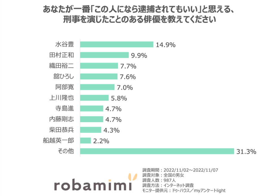 「あなたが一番「この人になら逮捕されてもいい」と思える、刑事を演じたことのある俳優を教えてください」と質問したところ、第一位に輝いたのは「水谷豊(14.9%)」でした。水谷豊さんは2000年より20年以上にわたってシリーズ放送されている「相棒」の顔です。第2位には古畑任三郎を演じた「田村正和(9.9%)」、第3位は踊る大捜査線の「織田裕二(7.7%)」という結果でした。逮捕されてもいいと思える理由について、「右京さんは、どんなことがあっても(情に流されない)捕まえるので、しょうがない。」(40代女性/水谷豊と回答)、「ダンディだし淡々と追い詰められたら反論もできなさそう」(30代女性/田村正和と回答)、「逮捕された後も気にかけてくれそうだから」(30代男性/織田裕二と回答)などが寄せられました。