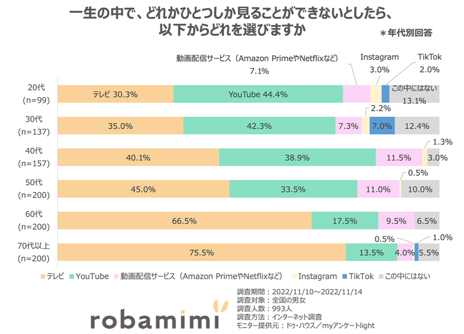 ・一生の中でどれかひとつしか見ることができないとしたら?40代を境に「YouTube」を「テレビ」が逆転