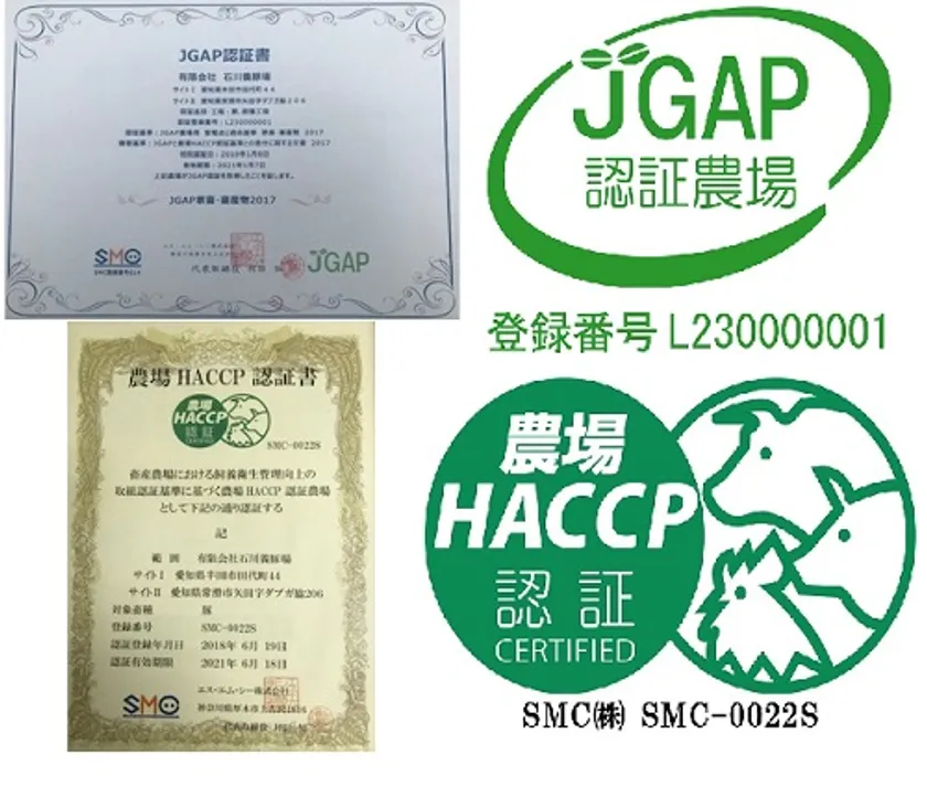 有限会社石川養豚場(所在地:愛知県半田市、代表取締役:石川 安俊)は、食品の安全を守る為の畜産農場における飼養衛生管理向上の取組認証基準に基づく農場HACCPを2018年6月に認証を取得し、2019年1月には食の安全や環境保全に取り組む農場に与えられる「JGAP家畜・畜産物2017認証」を取得いたしました。