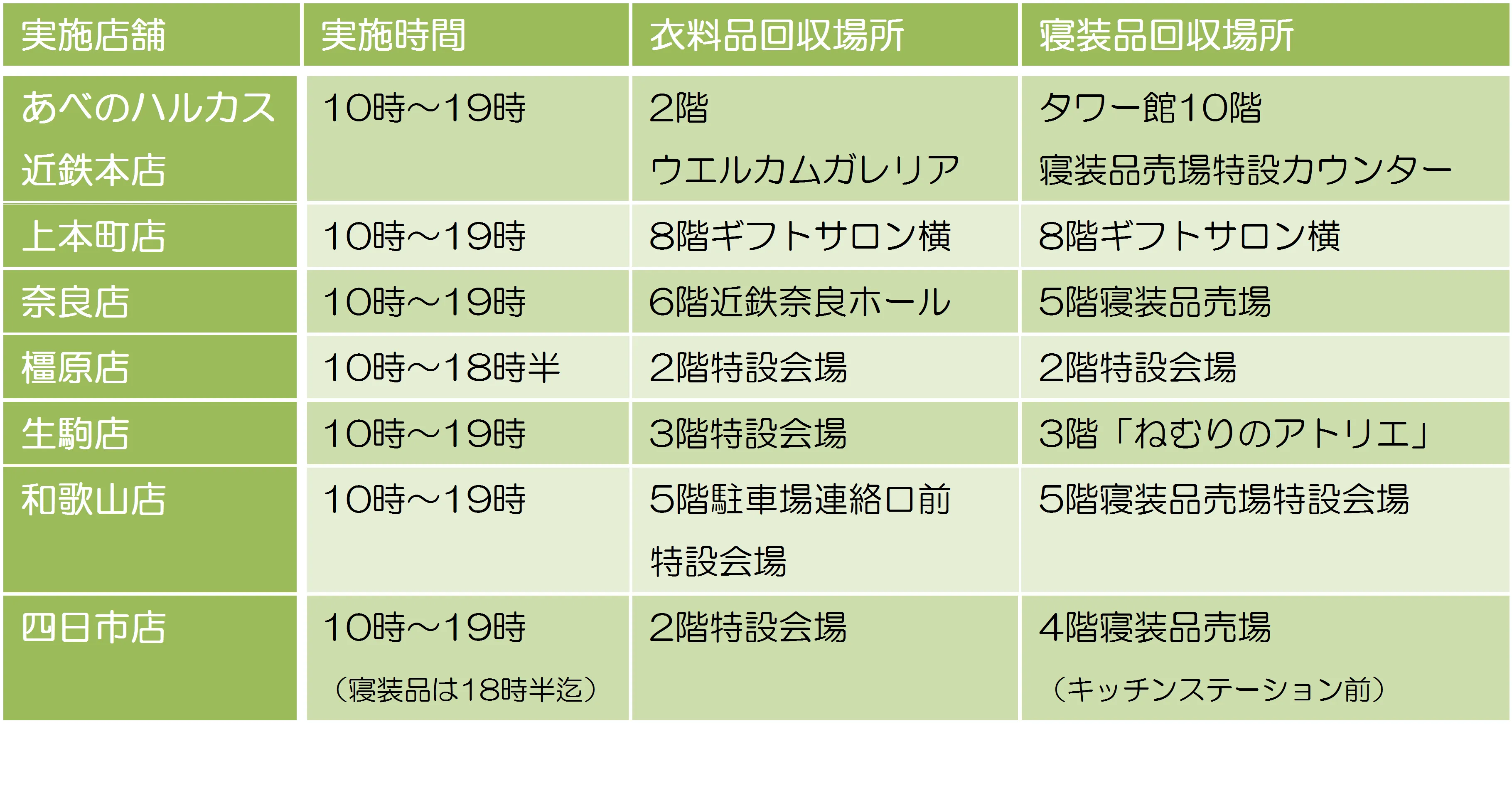 このたび近鉄百貨店7店舗において、リサイクルによる循環型社会の実現を通じて社会貢献を行うことを目的に、お客様のご不用の衣料品、寝装品を引き取り、次の資源へ活かす「近鉄のリサイクルキャンペーン」を開催いたします。